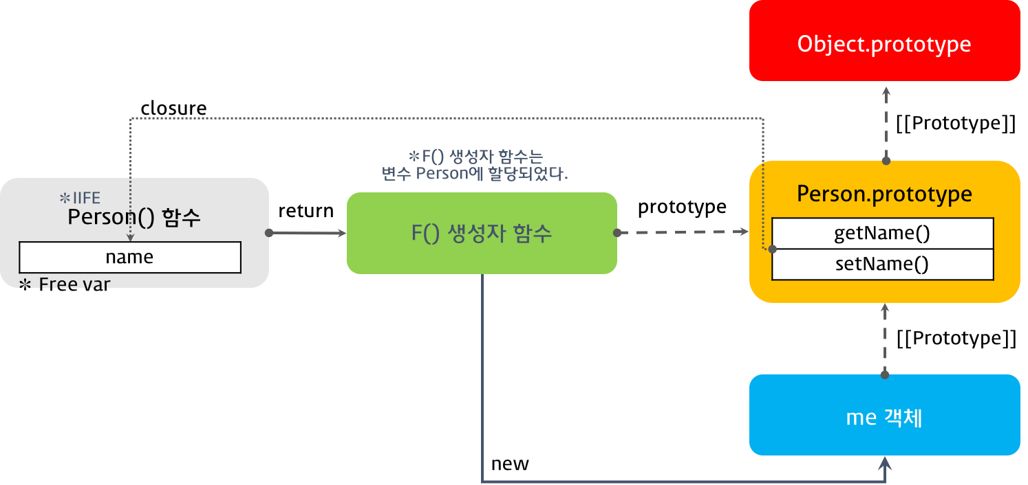 - 객체지향 특징 : 상속, 캡슐화 -> 프로토타입 체인과 클로저으로 구현