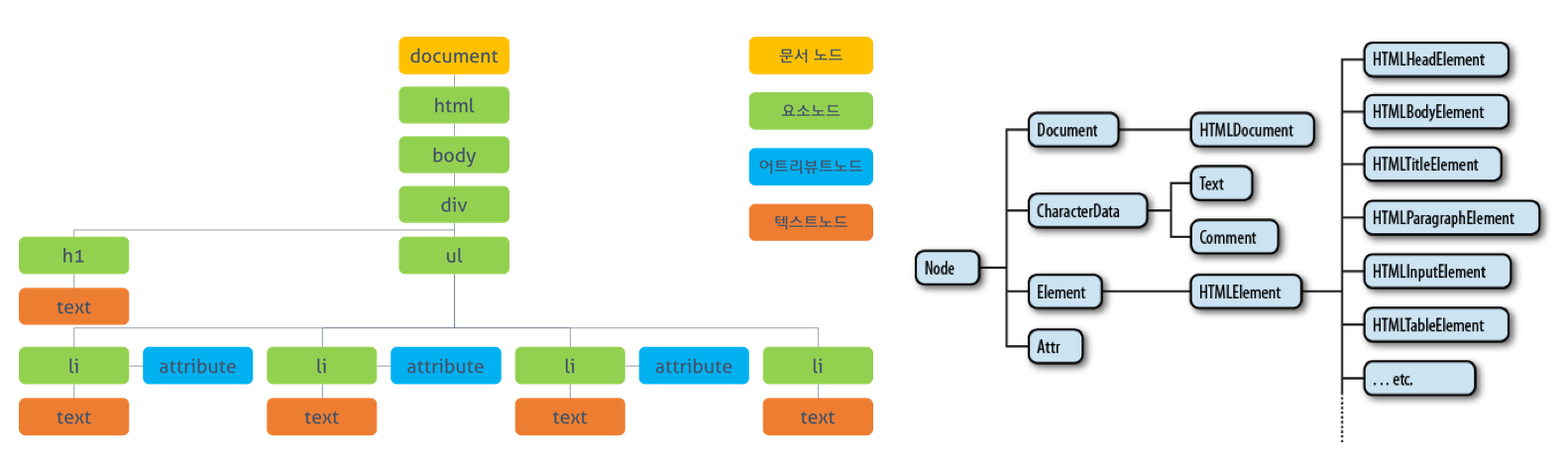 - 문서 노드 (Document Node) : 트리 최상위에 존재하며 Element, Attribute, Text Node에 접근하려면 문서노드를 통해야함